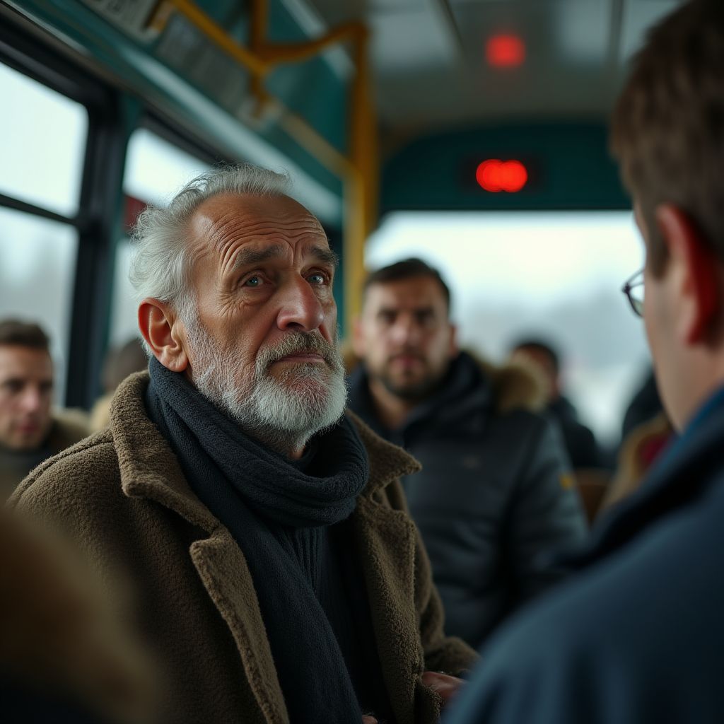 Автобус остановился на светофоре, и водитель резко заглушил мотор. “Эй ты!” — его голос разорвал тишину салона, обращаясь к парню под капюшоном. Пассажиры насторожились: у кого-то мелькнуло удивление в глазах, кто-то хмыкнул с недовольством.